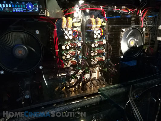 Caratteristiche Audio: L'impianto audio è costituito da diffusori EKOS Acoustic TLS1 da parete montati con cornici e tele fono trasparenti personalizzate. Amplificate con moduli Digliclear da 300W/8ohm l'uno.